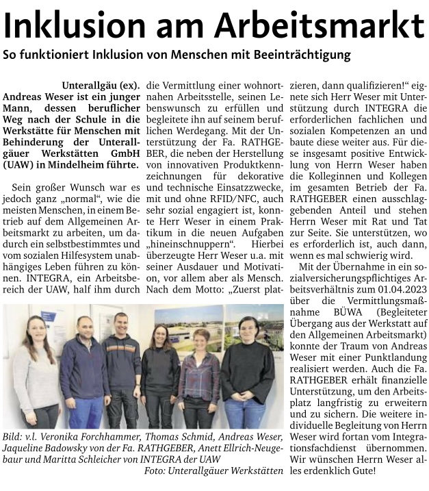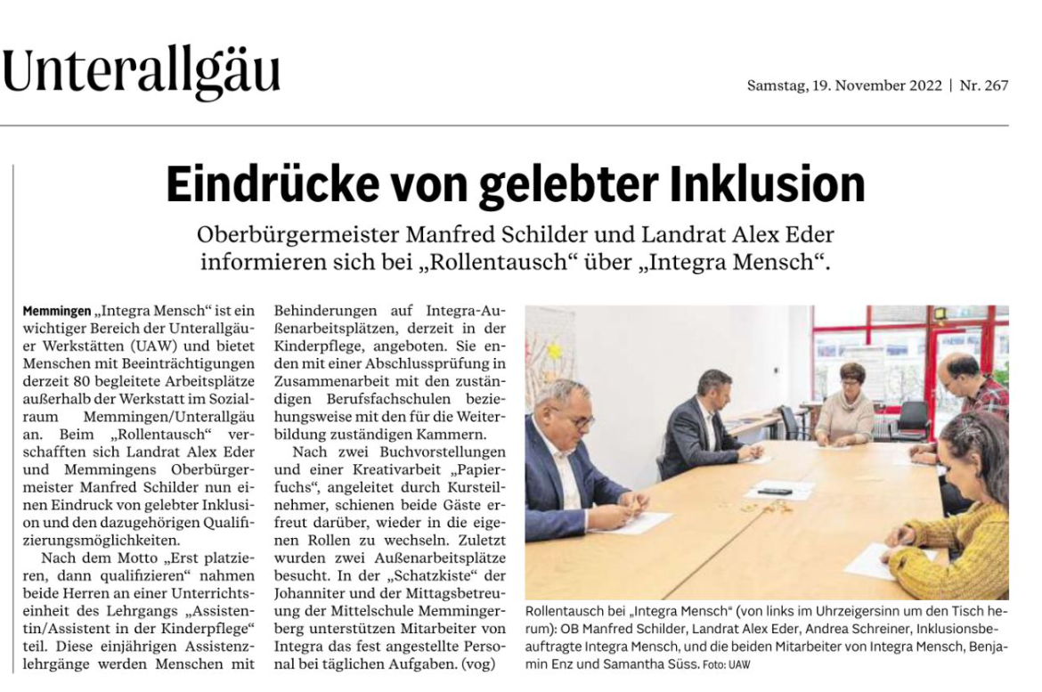Im Mai 2012 startete INTERGA mensch mit einer festlichen Auftaktveranstaltung in der Stadthalle in Memmingen seinen Beginn als „neues Projekt“ der Unterallgäuer Werkstätten. Seit dem bietet INTEGRA mensch Menschen mit Behinderungen aus der Region „passgenaue und individuell begleitete Außenarbeitsplätze“ bei unterschiedlichsten Kooperationspartnern auf dem allgemeinen Arbeitsmarkt an. Neben dem Inklusionsgedanken „Arbeiten, wo alle arbeiten“ gehört die Vermittlung in sozialversicherungspflichtige Anstellung zu den Zielen vieler unserer INTEGRA Mitarbeiter.